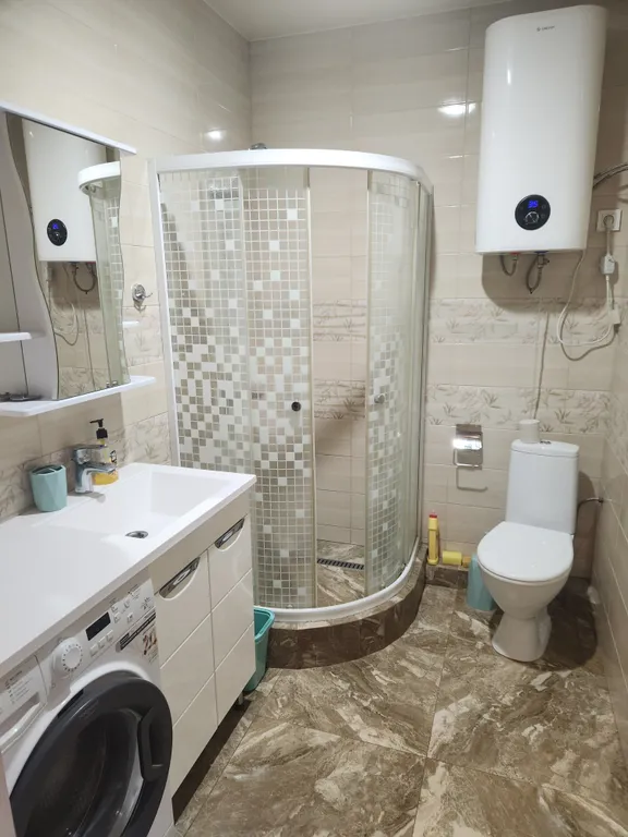 В квартире большая кровать, раскладной диван, кухня, санузел с душкабиной.
