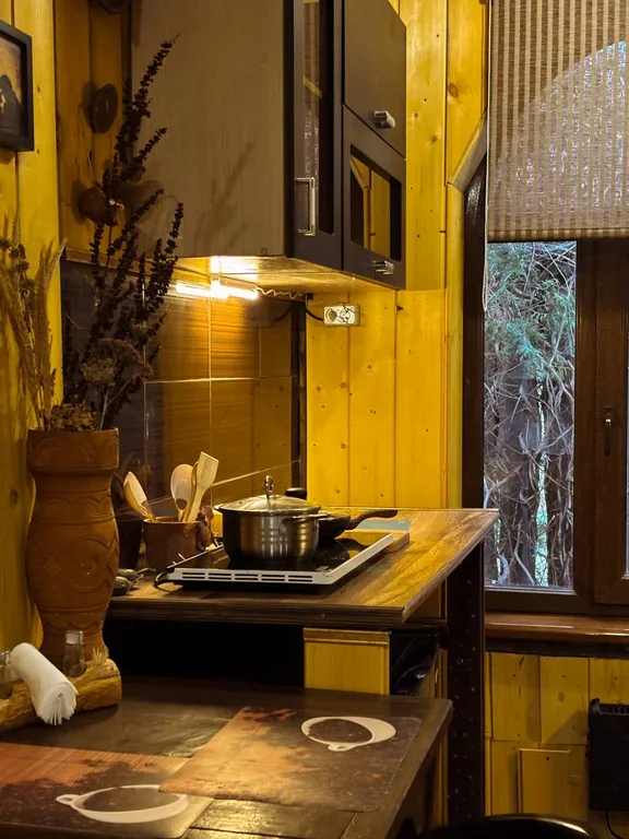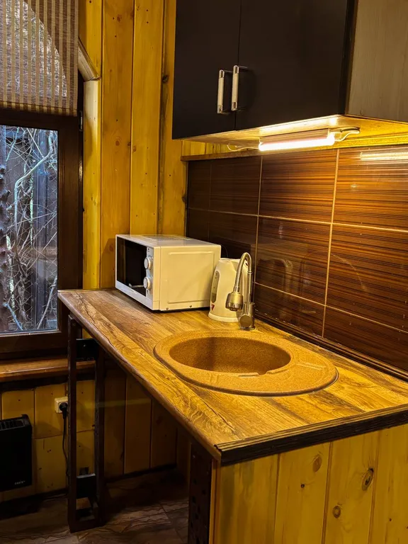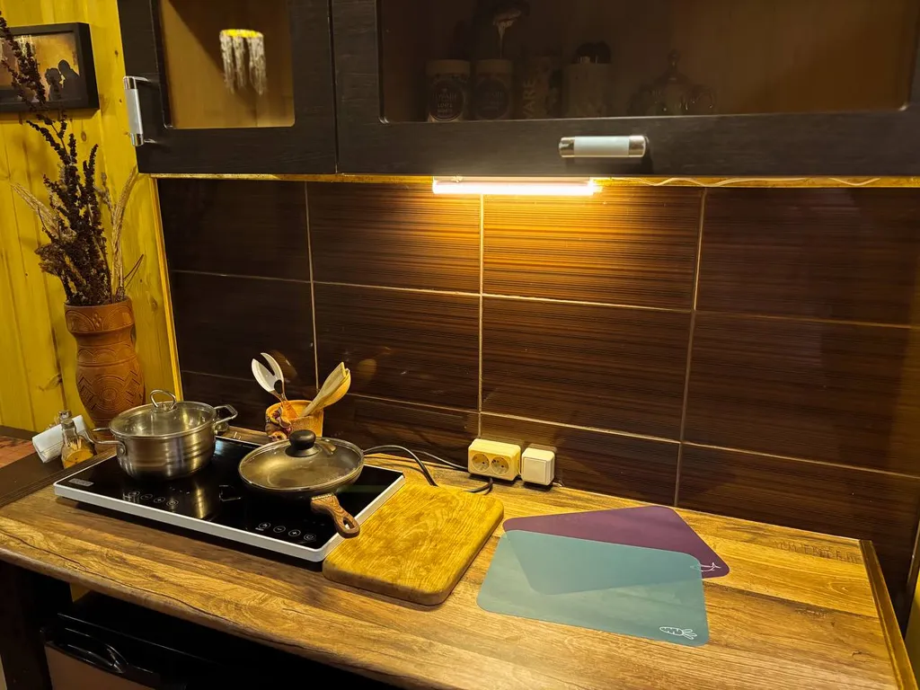 Полноценная кухня оборудована холодильником, плитой, микроволновкой, посудой.
