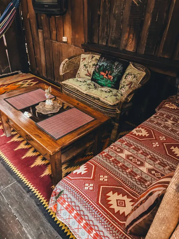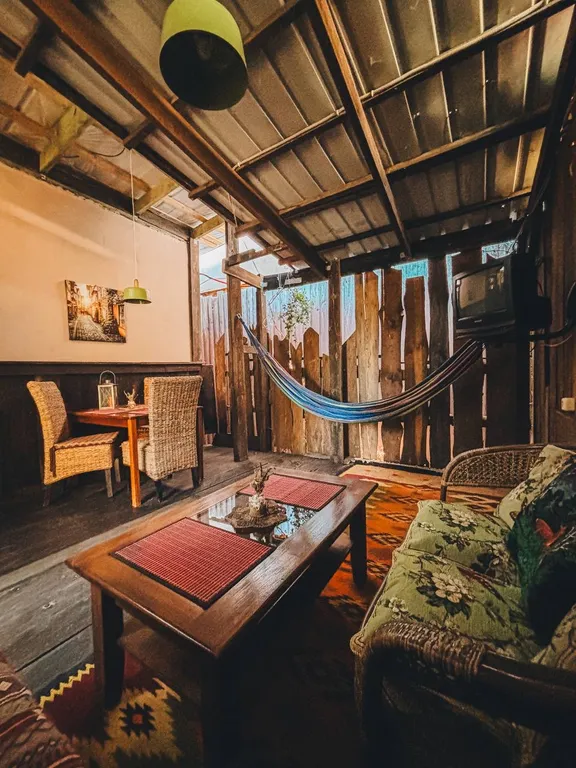 Веранда оборудована обеденной зоной, гамаком, ротанговый мебелью.