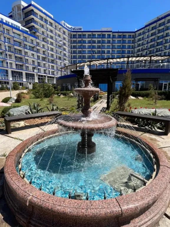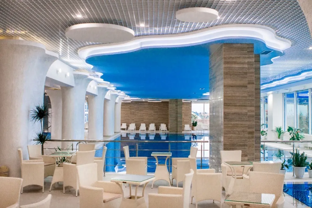 В курортный комплекс входят: открытый бассейн (бесплатный), анимация, свой пляж (50м) с шезлонгами и зонтами, оборудованные детские игровые площадки, 5 ресторанов, бары, ночной клуб, летний кинотеатр, банный комплекс и SPA – центр (35%), тренажерный зал. На территории находится лучший в Севастополе Аквапарк, Дельфинарий, Динопарк, красивый парк, теннисные корты, ухоженная территория с беседками и местами отдыха, с ландшафтным озеленением можжевельника, сосны, кедры, туи, розы.