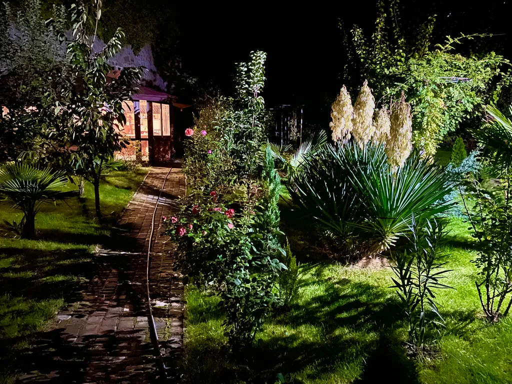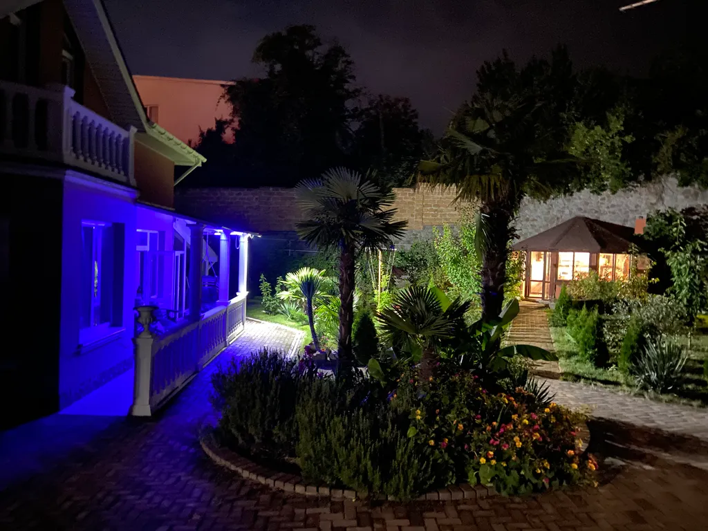 - Ландшафтный дизайн. Тропические растения, вечерняя подсветка.
