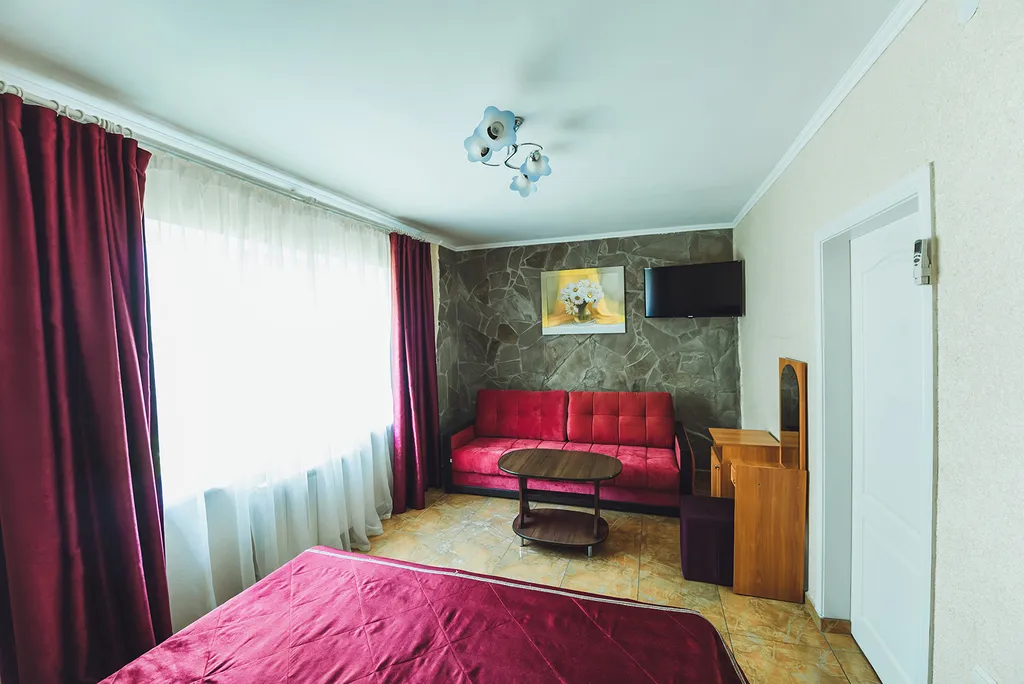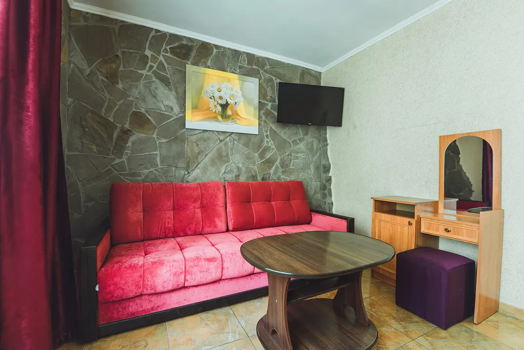 Номер (холл и комната). В холле — шкаф для одежды и посуды, односпальный диван. В комнате — две односпальные кровати, тумбочки, раскладной двухспальный диван или мягкий уголок, туалетный столик, журнальный столик.